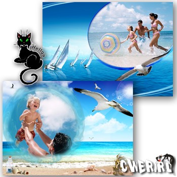 Скрап-набор в морском стиле Along The Beach с элементами, фонами, алфавитом и цифрами. Чайка на бревнах, парусник, компас, маяк, сеть, пальма, морская звезда, ракушки, вода и фоторамки.