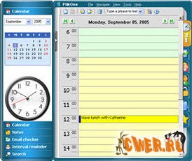 Разработчики этого элегантного персонального органайзера не стали "грузить" пользователя непонятным интерфейсом, а просто полностью повторили его бумажный аналог, что оказалось крайне удобным и не требует от пользователя никаких усилий в плане обучения. PIMOne имеет все необходимое для этого вида программ: часы, календарь с праздниками и событиями, еженедельник, расписание дня, заметки, лист намечено-сделано, пароли, адресную книгу, сервис напоминания по всем статьям, и пр. включая шифрование данных с использованием пароля. В зависимости от предпочтений имеет несколько на выбор привлекательных видов оболочек, которые дополнительно можно скачать с официального сайта.