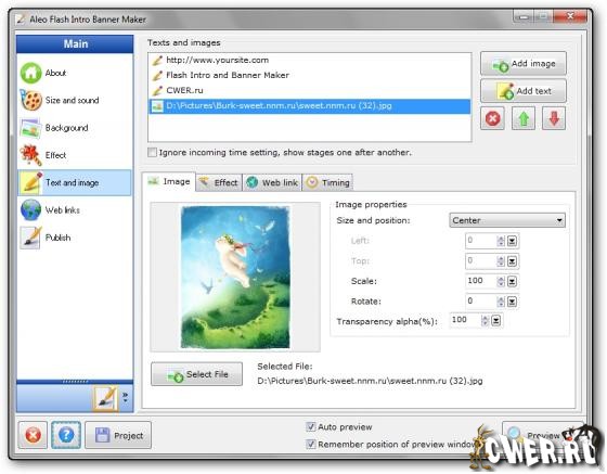 Простой и чрезвычайно удобный пользовательский интерфейс программы Flash Intro and Banner Maker, в стиле мастера, поможет вам создать различные по красоте и креативности баннеры всего несколькими щелчками мыши без какого либо знания основ Flash и его Actionscriptов. Имеет множество фоновых и текстовых эффектов, которые настраиваемы, включая предложения, шрифты, связанные интернет ссылки на ресурсы, раскраска, звуки и т.д.