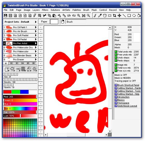 TwistedBrush - программа для художников. Она имеет большое количество самых разнообразных инструментов для рисования, от красок до мелков и карандашей. Эта программа глубоко поражает буквально с первого запуска. Интерфейсом Twisted-Brush мало похож на другие редакторы, хотя и предоставляет все необходимые возможности: работа с буфером обмена, зуминг и, конечно же, рисование. Причем рисующий инструмент только один — кисточка, зато количество (более 3000 штук!!!) и качество пресетов для рисования, а также многообразие форм и регулируемость размеров и цветовой гаммы позволяют человеку, не особо одаренному художественными талантами, буквально за пару минут изобразить то, что — возможно, более аккуратно и качественно, конечно — профессионал, работающий в другом редакторе, рисовал бы, наверное, не один час.