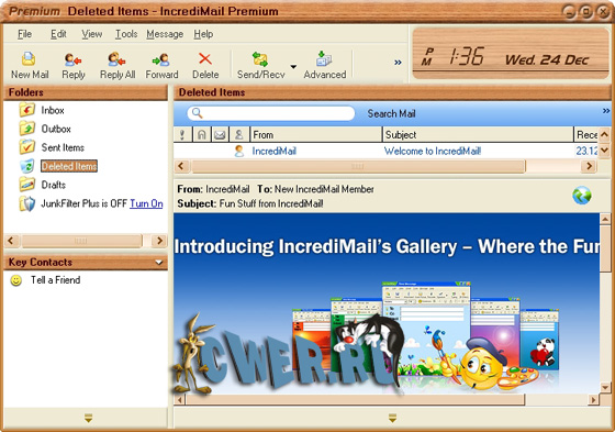 IncrediMail - очень оригинальная почтовая программа, причем главная ее особенность - не набор функций по обработке корреспонденции (хоть и их немало), а совершенно новые, не имеющиеся ни в одной из других почтовых программ, возможности по оформлению писем с помощью анимации, создания "прыгающего" текста, включения в текст графических смайликов и многого другого, включая самые разнообразные 3D-эффекты. Результатом всего этого станет то, что самое обычное письмо превратится в настоящее произведение искусства (если, конечно, вы не переборщите с эффектами) с вашей личной подписью - встроенный в программу редактор позволяет вытворять и не такое (кстати, эта опция может очень пригодиться для подготовки бланков "деловых" писем).