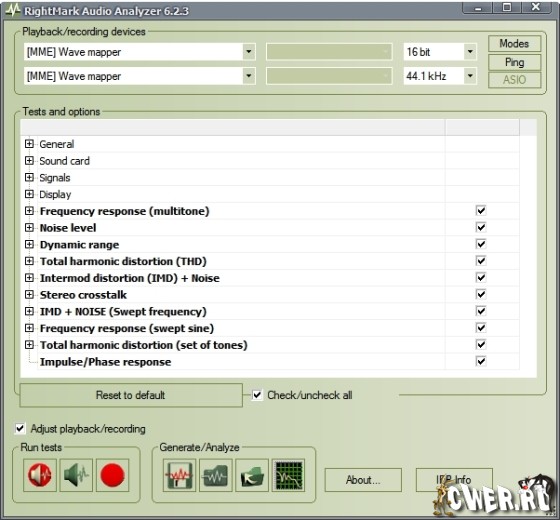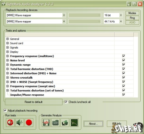 Пакет для тестирования звуковой карты на ее пригодность к высококачественному воспроизведению и записи звука. Тесты АЧХ, КНИ, уровня шума, динамического диапазона и взаимопроникновения стереоканалов в сочетании с простым интерфейсом помогут оценить звуковую карту даже новичку в цифровом аудио - для каждого теста выводится краткий результат и оценка этого результата.