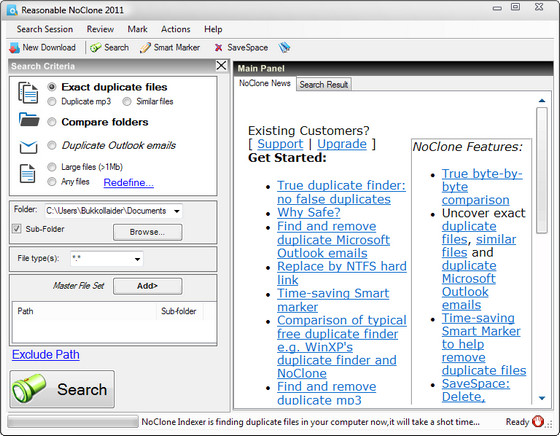 NoClone 2011 Enterprise — программа для поиска и удаления дубликатов файлов на отдельном компьютере или в локальной сети. За считанные минуты данная программа обнаружит все дубликаты на всем жестком диске или в указанном месте. Сравнение файлов происходит не через CRC, а побайтово. В зависимости от степени вашей решимости проводить генеральную уборку, можно назначать поиск файлов по побайтовому сравнению, по названиям или просто по «внешней» схожести. Программа может проводить поиск повторяющихся файлов любого формата, от библиотек DLL до файлов формата MP3. Если процедура поиска занимает много времени, ее можно продолжить в следующий раз, сохранив результаты текущей сессии в формате CSV. NoClone 2011 позволит вам эффективно освободить место на жестком диске и навести порядок, удалив ненужные дубликаты файлов.