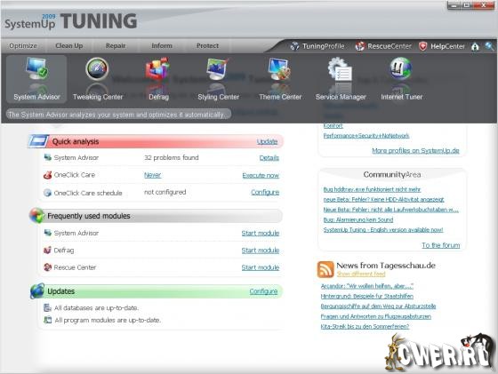 SystemUp 2009 Tuning - комплексный набор инструментов для оптимизации и индивидуальной настройки Вашей системы Windows на максимальную и стабильную работу. Программа имеет все самое необходимое: дефрагминтатор, чистильщик реестра, систему восстановления данных, удаления данных, оптимизатор памяти и интернет соединения, модуль корректного удаления программ и еще более 400 необходимых оптимизаторов и настройщиков системы. Программа имеет интуитивно понятный интерфейс, что делает работу с ней несомненно простой и удобной.