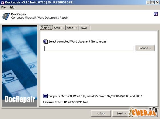 Программа для восстановления повреждённых doc-файлов(файлов формата Microsoft Word). Интерфейс выполнен в виде мастера, весь процесс восстановления испорченных данных проходит за несколько диалоговых шагов. DocRepair работает с файлами Microsoft Word 6.0, Word 95, 97, 2000, XP, 2003, 2007 for Windows, Word For Mac.