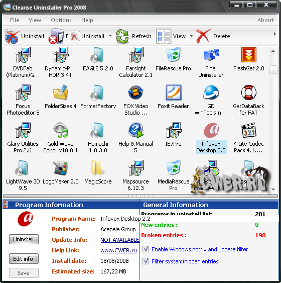 Your Uninstaller! - Обеспечивает решение задач по деинсталляции приложений, установленных на вашем компьютере. Он служит заменой стандартному диалогу Добавить/Удалить программу Windows. При этом работает приблизительно в 5-10 раз быстрее. Может показывать соответствующие значки приложений. Имеется функция поиска приложения по ключевому слову. Your Uninstaller! автоматически обнаруживает неисправные ключи реестра и полностью удаляет их по вашему разрешению. Возможно ручное удаление записей об установленных программах из системного реестра.