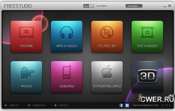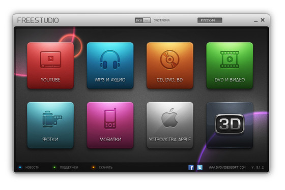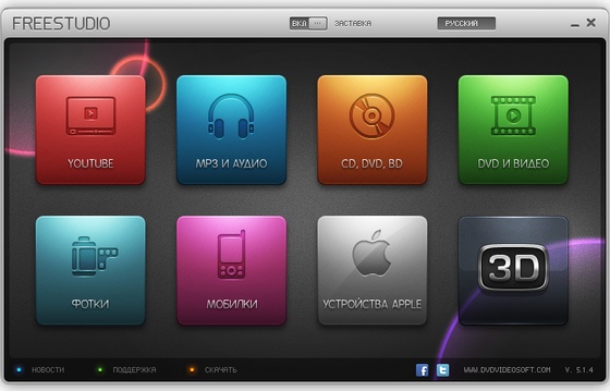 Новый Free Studio Manager - это единый пакет программ в совершенно новом дизайне, объединивший все бесплатные мультимедийные приложения, разработанные DVDVideoSoft. Он состоит из следующих 8 разделов: YouTube, MP3 и Аудио, CD-DVD-BD, DVD и Видео, Фотки, Мобилки, Устройства Apple, 3D. Таким образом, новый интерфейс, включающий в себя все программы, позволяет быстро найти нужную именно вам.