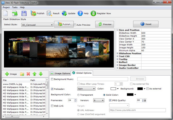 Aleo 3D Flash Slideshow Creator - программа для создания качественных 3D слайд-шоу с различными эффектами. Сделайте трехмерный показ слайдов фотографии, трехмерное меню документа, трехмерный показ карусели, трехмерный скроллер изображения и ролик изображения без знания Flash технологий.