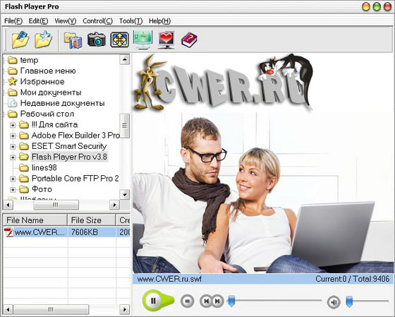 Flash Player Pro - усовершенствованный проигрыватель flash анимации. Помимо просмотра, позволяет сохранять ролики на жесткий диск, делать скриншоты и ставить результат в качестве обоев на десктоп. Плюс ко всему, конвертирует swf и exe между собой.