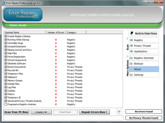 Error Repair Professional - это небольшая утилита для исправления ошибок в настройках операционной системы. Программа обладает высокой скоростью работы и за считанные секунды проверит ваш компьютер на наличие ошибочных записей и сама исправит их. Для продвинутых пользователей присутствует ручной режим работы. Программа может найти неполадки в реестре, библиотеках данных системы и приложений, а также серьезные ошибки, допущенные пользователем, ставящие безопасность системы под угрозу.