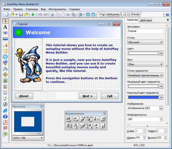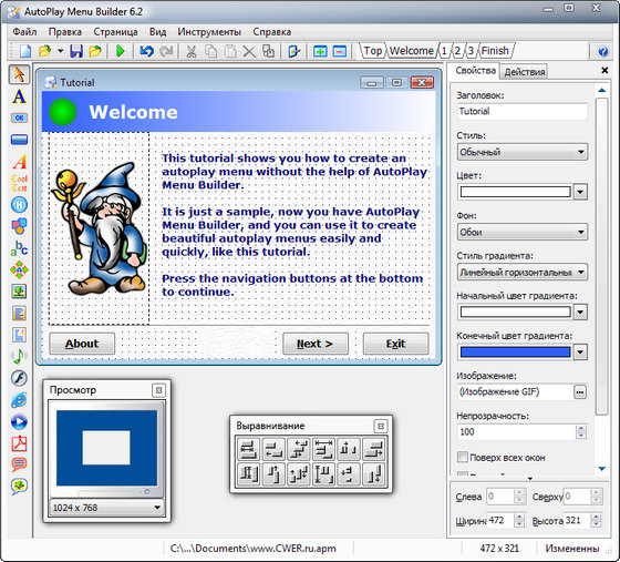 AutoPlay Menu Builder - это один из лучших инструментов для быстрого создания качественных меню автозапуска. При работе с программой Вам не нужно иметь никаких навыков программирования! Достаточно иметь желание, время и немного фантазии . В созданном меню можно открывать документы, запускать приложения, проигрывать мультимедиа-файлы и многое другое.