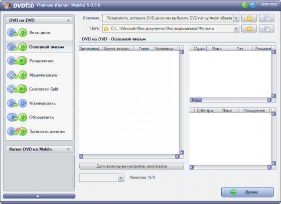 DVDFab Platinum – мощный, многофункциональный программный продукт для копирования DVD дисков с возможностями гибкой обработки видеопотока. Программа является одной из лучших на сегодняшний день, из инструментов для копирования, разбиения, пережатия и конвертирования DVD дисков с фильмами. Снимает все защиты и ограничения с диска и при желании пережмет диск большой емкости и вместит его в обыкновенную пустую DVD болванку с минимальными потерями качества (DVD9->DVD5) или разобъет фильм на два диска с полным переносом его меню, удалит всю рекламу, запишет только фильм и многое другое. Программа имеет интуитивно понятный, мультиязычный интерфейс включая русский.