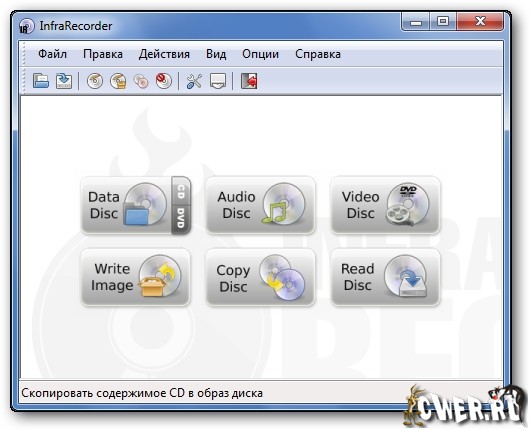 Программа для записи оптических дисков InfraRecorder бесплатна и, казалось бы, похожа на свои аналоги. Но при маленьком размере её функциональность довольно высока. Кроме непосредственно обязательной функции записи дисков с данными, аудио- и видеодисков, программа позволяет создавать BIN и ISO образы, а если у вас только один физический привод, то и использовать их как промежуточную стадию при копировании дисков. Есть возможность извлечения треков с аудиодисков в формат WAV. Также пользователь может установить поддержку файловой системы UDF, провести симуляцию записи, выбрать скорость записи и многое другое.