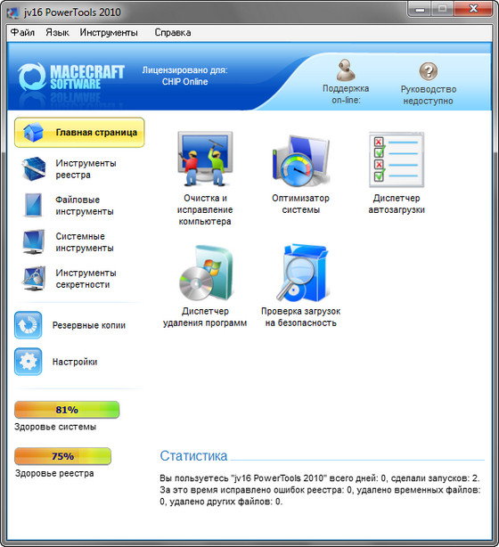 jv16 PowerTools 2012 - разработка, представляющая собой набор утилит для комплексной работы с реестром (очистка, правка, автозагрузка, установка/удаление, мониторинг системного реестра, поиск - замена), с файлами (поиск дубликатов, органайзер файлов), умеющая очищать диски и управлять компьютерами в локальной сети.