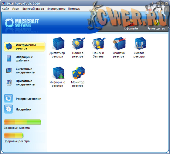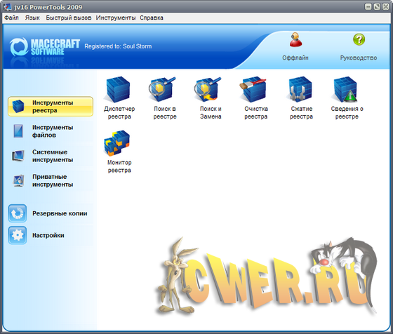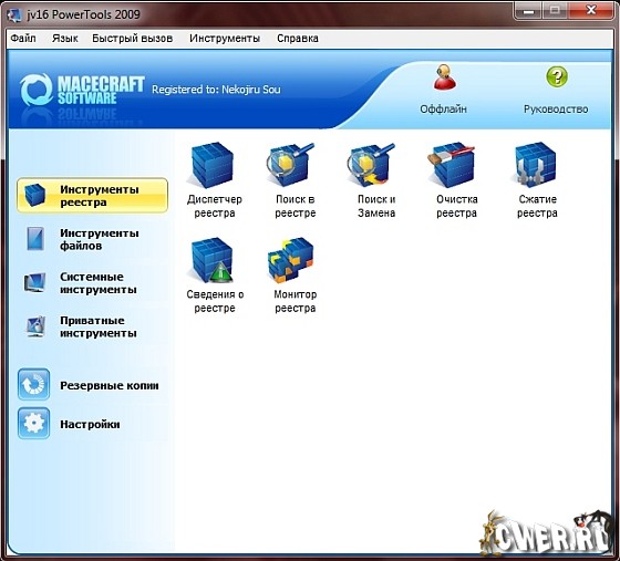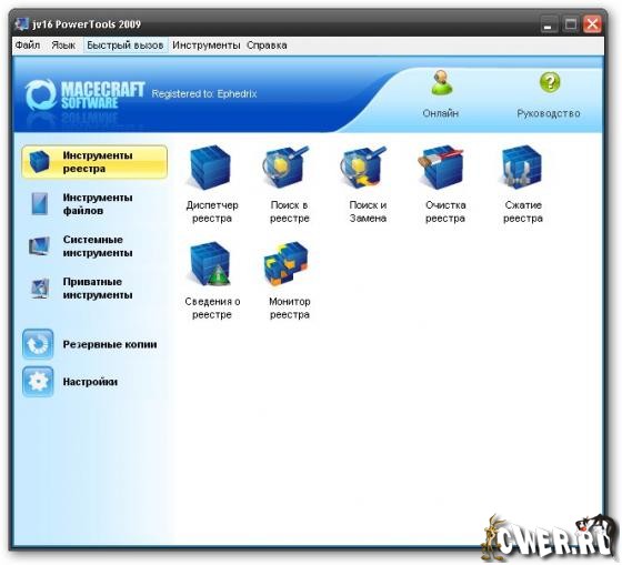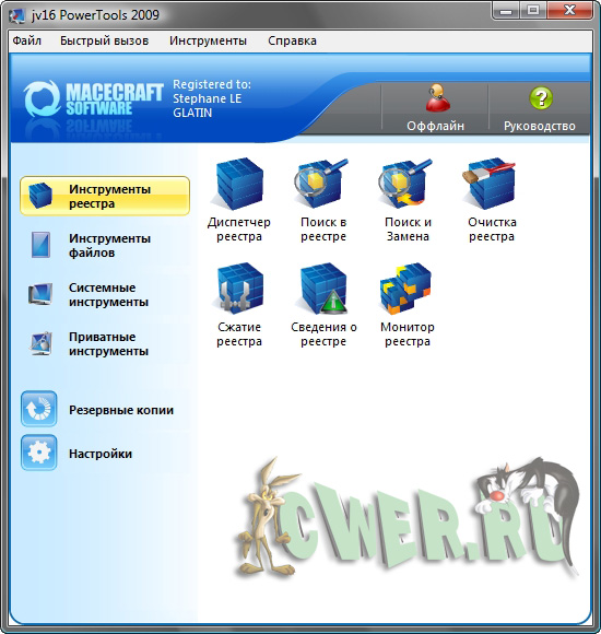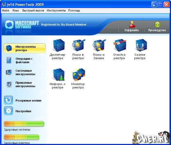 jv16 PowerTools 2009 - это одна из лучших программ для работы с системным реестром и поддержания в оптимальном состоянии. Включает в себя инструменты для работы с реестром: мощный менеджер реестра - позволяет работать со списком программ из автозагрузки и деинсталляции, со списком зарегистрированных в системе типов файлов, расширений, контекстным меню IE (с тем, в которое часто вставляют свои пункты менеджеры закачек) и некоторыми другими. Этот менеджер часто помогает вручную удалить остатки после автоматической очистки реестра программы. Возможно использование в локальной сети.