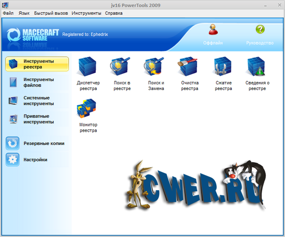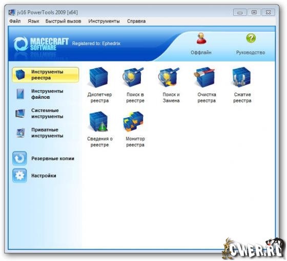 jv16 PowerTools - одна из лучших программ для работы с системным реестром. Включает в себя инструменты для работы с реестром: мощный менеджер реестра - позволяет работать со списком программ из автозагрузки и деинсталляции, со списком зарегистрированных в системе типов файлов, расширений, контекстным меню IE (с тем, в которое часто вставляют свои пункты менеджеры закачек) и некоторыми другими. Этот менеджер часто помогает вручную удалить остатки после автоматической очистки реестра программы. Возможно использование в локальной сети.
