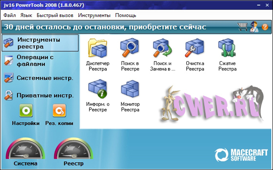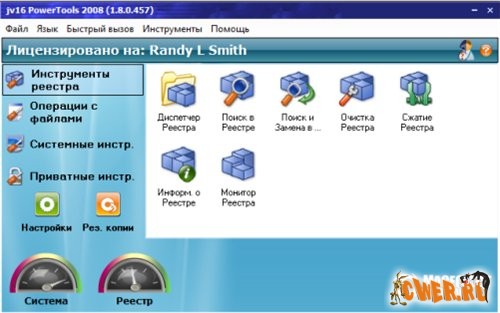 jv16 PowerTools 2008 - это одна из лучших программ для работы с системным реестром и поддержания в оптимальном состоянии. Включает в себя инструменты для работы с реестром: мощный менеджер реестра - позволяет работать со списком программ из автозагрузки и деинсталляции, со списком зарегистрированных в системе типов файлов, расширений, контекстным меню IE (с тем, в которое часто вставляют свои пункты менеджеры закачек) и некоторыми другими. Этот менеджер часто помогает вручную удалить остатки после автоматической очистки реестра программы. Возможно использование в локальной сети.