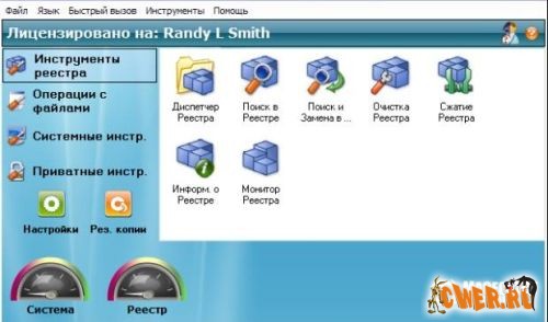 Одна из лучших программ для работы с системным реестром и поддержания в оптимальном состоянии. Включает в себя инструменты для работы с реестром: мощный менеджер реестра - позволяет работать со списком программ из автозагрузки и деинсталляции, со списком зарегистрированных в системе типов файлов, расширений, контекстным меню IE (с тем, в которое часто вставляют свои пункты менеджеры закачек) и некоторыми другими. Этот менеджер часто помогает вручную удалить остатки после автоматической очистки реестра программы. Возможно использование в локальной сети. Программа имеет мультиязычный интерфейс, включая Русский.