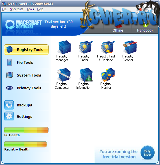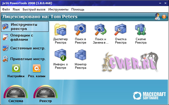 jv16 PowerTools - это одна из лучших программ для работы с системным реестром и поддержания в оптимальном состоянии. Включает в себя инструменты для работы с реестром: мощный менеджер реестра - позволяет работать со списком программ из автозагрузки и деинсталляции, со списком зарегистрированных в системе типов файлов, расширений, контекстным меню IE (с тем, в которое часто вставляют свои пункты менеджеры закачек) и некоторыми другими. Этот менеджер часто помогает вручную удалить остатки после автоматической очистки реестра программы. Возможно использование в локальной сети.