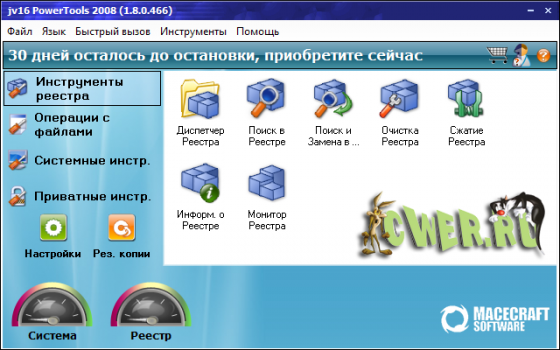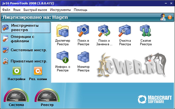 Вышла новая финальная версия программы jv16 PowerTools 2008, представляющей собой набор утилит для комплексной работы с реестром (очистка, правка, автозагрузка, установка/удаление, мониторинг системного реестра, поиск - замена), файлами (поиск дубликатов, органайзер файлов), очистка дисков и управление компьютерами в локальной сети.