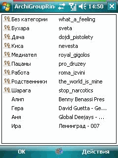 ArchiGroupRings - приложение для установки мелодий на группу контактов. Небольшое предисловие: когда купил коммуникатор, то был сильно удивлен что стандартными средствами винды нельзя проделать эту простую процедуру, начал изучать софт который уже был. Тут было два варианта: либо прога постоянно висит в памяти и перехватывает звонок (например PhotoContacts), либо устанавливает персональную мелодию каждому контакту. Первый вариант показался слишком сложным и глючным, а приличных прог второго типа не нашел, ну и как всегда в таких случаях поступают истинные джедаи решил написать свою...