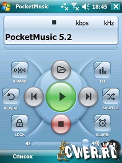 PocketMusic Player - продвинутый аудио-плеер с 10-полосным эквалайзером проигрывает музыку в форматах MP3, Ogg Vorbis и WMA. Есть вариант интерфейса с крупными кнопками, ориентированный на работу в горизонтальном положении экрана.