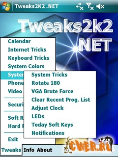 Tweaks2K2 .NET - твикер системы для КПК на базе Pocket PC, т.е. позволяет изменять ряд скрытых опций (в основном в системном реестре), соответственно, менять поведение системы, вид интерфейса и многое другое, а также просто ряд мелочей недоступных для правки через стандартный интерфейс. Всего в программе 139 функций для изменения.