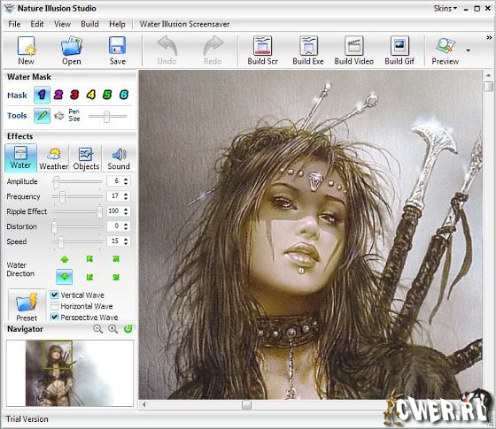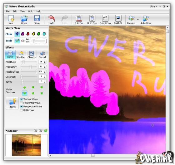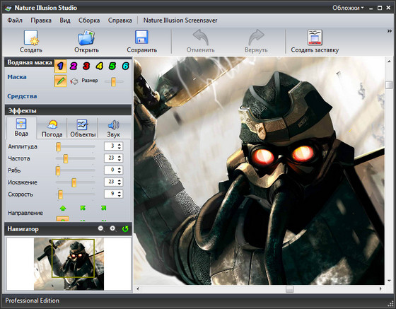 Nature Illusion Studio - программа поможет вам превратить обычные снимки в прекрасные анимированные пейзажи. Программа позволяет накладывать разные графические и звуковые эффекты, и затем конвертировать результат в экранную заставку, исполняемый файл, анимированный рисунок или видео-файл. Загружаете свою любимую фотку с пейзажем, выделяете с помощью масок области, которые нужно оживить (напр. поверхность водоема, ручей, водопад и т.д.), добавляете звук (шум прибоя, пение птиц, журчание воды), можно добавить падающий снег или дождь. Вобщем, теперь вы можете самостоятельно создавать скринсэйверы профессионального качества, делать автоские анимированые GIF на основе ваших фото.