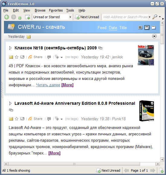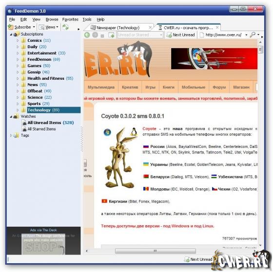Вышла новая версия FeedDemon - одна из самых популярных программ для получения новостей с сайтов по технологии RSS и XML. По сравнению с обычным просмотром сайтов с помощью браузера, технология RSS имеет два существенных плюса - возможность практически полной автоматизации и значительное уменьшение обьема скачиваемых данных за счет отсутствия в получаемых новостях рекламы (нет ни баннеров, ни чего-либо еще).