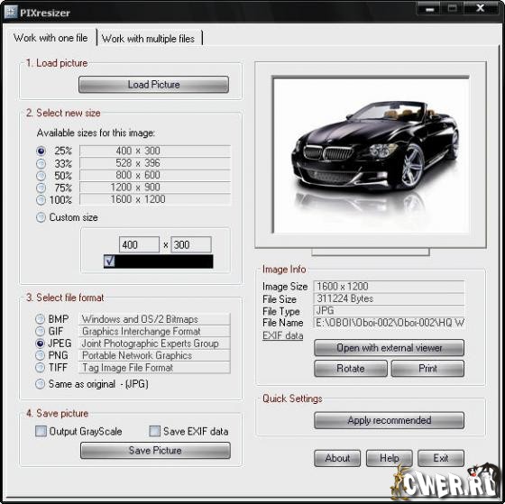 Программа для изменения размера изображения, вы сможете быстро подогнать изображение под необходимый вам размер и отправить изображение по электронной почте. Измененные изображения могут быть отправлены в интернет, причем оригиналы изображений изменены не будут. Программа автоматически распознает размеры изображения и предлагает выгодный для преобразования размер. Программа обладает функцией предпросмотра и работает с файлами .bmp, .gif, .jpg, .png и .tif Это хорошее решение для фотографов и веб мастеров.