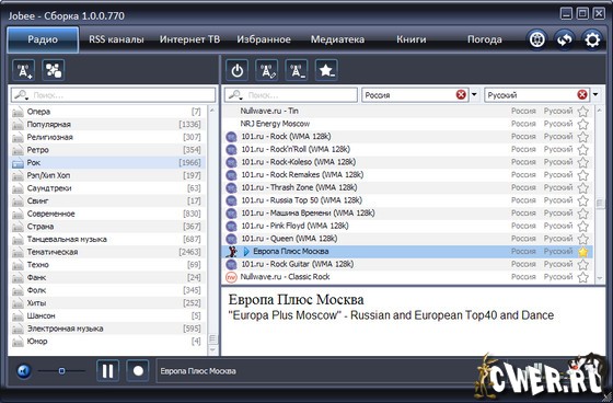 Jobee – это удобный плеер, предназначенный для комфортного прослушивания интернет радиостанций и аудио-подкастов, просмотра интернет-телевидения, чтения RSS-лент. Программа запомнит до какого момента вы прослушали аудио-подкаст или какую последнюю радиостанцию вы слушали. Он сам скачает Вам обновления в RSS-лентах и сообщит об этом нотификатором в правом нижнем углу экрана.