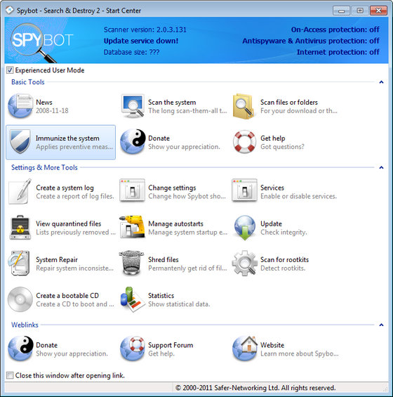 Spybot - Search & Destroy - утилита для поиска и удаления программ-шпионов (spyware), рекламных вставок (adware), программ похитителей данных (hijackers) и прочего вредоносного ПО. Spybot - Search & Destroy сканирует жёсткий диск и реестр операционной системы, выявляя тем самым шпионские модули и вредоносные ключи. База данных программы постоянно обновляется разработчиками, её обновление происходит из соответствующего раздела, аналогично обновлению антивируса. Интерфейс прост и понятен: кнопок и управляющих меню - минимум, работать с программой не составляет труда. Перед проверкой системы на наличие в ней шпионских модулей рекомендуется сделать копию реестра. В программе также предусмотрен откат, т.е. вы всегда можете вернуть ключи и файлы, которые были удалены. Несмотря на свою бесплатность, эта программа является одним из признанных лидеров в своём классе.
