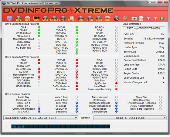DVDInfoPro - утилита для тестирования и получения подробной информации о CD/DVD, Blu-ray и HD-DVD-приводах и дисках. Кроме этого, данная программа позволяет тестировать установленные в привод компакт-диски и DVD, а также быстро стирать и форматировать диски DVD-R/RW и DVD+R/RW. Поддерживаются практически все виды приводов, включая DVD+R DL (Double Layer), и все виды дисков, включая Blu-ray и HD-DVD.