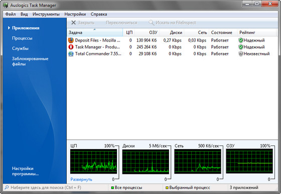 Auslogics Task Manager покажет сколько памяти, процессора, диска и интернет трафика используется каждым процессом на компьютере. Это поможет Вам найти и уничтожить "прожорливые" процессы и троянцев, прячущихся в обычные файлы вроде explorer.exe. Программа также покажет запущенные на Вашем компьютере сервисы. Также уникальной является способность программы отображать список заблокированных файлов, и какие программы открыли данные файлы. Это незаменимо для тех, кто хочет удалить или скопировать заблокированные файлы, а также полезно, если Вы не знаете почему данный файл был заблокирован.
