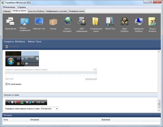 TweakNow WinSecret 2012 - программа для тонкой настройки Windows. Для удобства пользователя параметры разделены по категориям: приложения, панель управления, рабочий стол, сеть и Интернет, информация о компьютере, учетные записи пользователей, ядро Windows и т.д. Предусмотрен откат сделанных изменений.