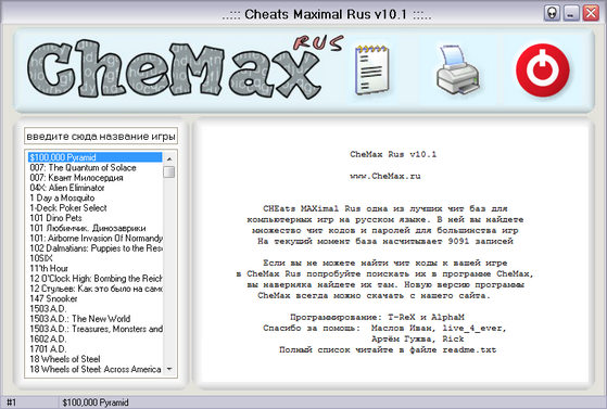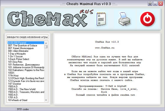 CheMax - наибольшая из известных на данный момент программ, которые являют собой базу данных с кодами для игр. Простой и красивый интерфейс, малый размер, и при этом огромное количество представленных игр. Особенностью базы является отсутствие в ней хинтов и прочей “отсебятины“, вашему вниманию представлены только коды (cheats, hex-cheats) и пароли (passwords).