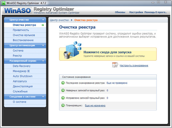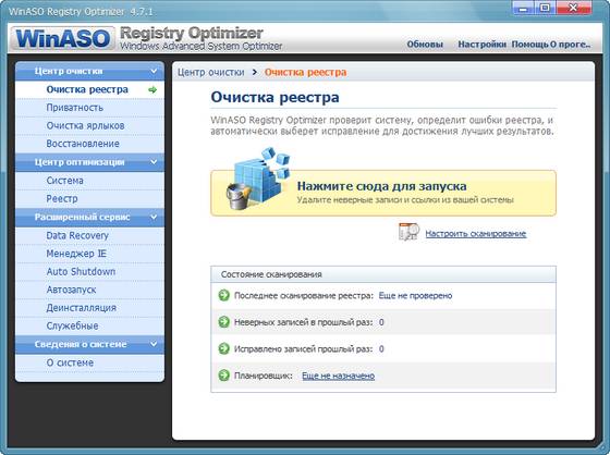 WinASO Registry Optimizer - утилита для чистки и восстановления системного реестра Windows. Программа сканирует реестр и удаляет ошибочные или устаревшие записи, оптимизируя работу Windows и предохраняя ее от всевозможных сбоев. Предусматривает проверку реестра по расписанию, дефрагментацию реестра, создание списка ошибок, которые программа должна игнорировать, менеджер автозагрузки, деинсталляцию приложений, очистку диска от временных файлов и файлов интернета. Возможна отмена произведенных изменений из резервной копии.