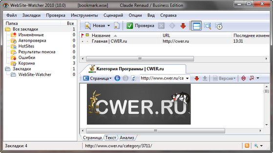 WebSite Watcher - мощная программа для мониторинга сайтов на предмет их обновления. При обнаружении изменений обновленные страницы сохраняются и на них цветом выделяются все изменения. Для более конкретного контроля за изменением определенной информации возможно использование хорошо настраиваемых фильтров. Программа поддерживает интеграцию с наиболее популярными браузерами - Internet Explorer, Firefox, Netscape и Opera.