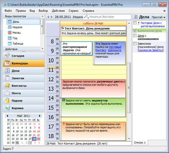 EssentialPIM - это менеджер персональной информации, который позволяет собирать и хранить различные данные в удобном, электронном виде. Все ваши задачи, дела, заметки, контакты, почта и пароли хранятся в графическом и легко доступном виде. Автоматический импорт данных из практически любого менеджера персональной информации. Синхронизация с самыми популярными онлайн сервисами, такими, как: Google, Yahoo, SyncML и CalDAV. Всё это позволяет иметь самые последние данные под рукой, доступные отовсюду, в любое время.