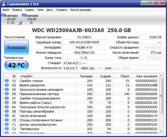 CrystalDiskInfo - отслеживает состояние жестких дисков, поддерживающих технологию S.M.A.R.T. Производит мониторинг и дает общую оценку "здоровья" вашего диска. Так же отображает детальную информацию о жестких дисках, установленных в компьютере (прошивка, серийный номер, стандарт, интерфейс, общее время работы и др.), а также выводит параметры атрибутов системы самодиагностики S.M.A.R.T. (ошибки чтения, производительность, запуски/остановки шпинделя, время поиска дорожки, количество циклов включения-выключения, ошибки секторов и многое другое).