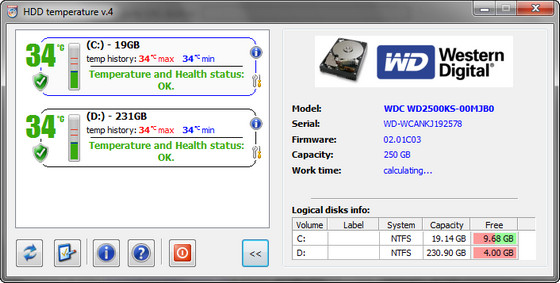 HDD Temperaturе - эта утилита выглядит иконкой в системном лотке, на которой отображается текущие температуры жестких дисков на выбор в цельсиях или фаренгейтах. Есть функции перевода системы в спящий режим (hibernate) в случае перегрева винчестера, а также отправки сообщения по сети в случае перегрева жесткого диска.