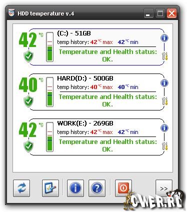 HDD Temperaturе - эта утилита выглядит иконкой в системном лотке, на которой отображается текущие температуры жестких дисков на выбор в цельсиях или файренгейтах. Есть функции перевода системы в спящий режим (hibernate) в случае перегрева винчестера, а также отправки сообщения по сети в случае перегрева жесткого диска.