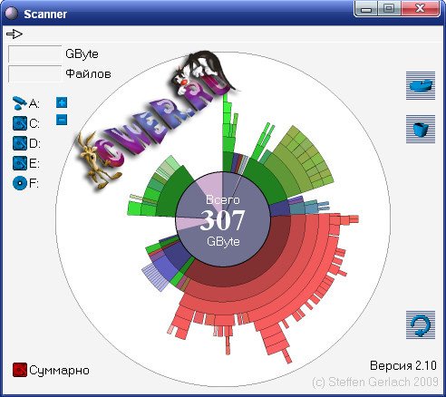 Scanner - программа для анализа содержимого жестких дисков, CD, дискет и других носителей: для начала показывает в виде наглядной диаграммы все папки и файлы, находящиеся в корне анализируемого диска, допуская после этого продвижение вглубь для получения сведений о содержимом под папок, а также отображает информацию о файлах и папках. Позволяет быстро удалить обнаруженные ненужные файлы и папки; работает без инсталляции; интерфейс - на том языке, который установлен в системе.