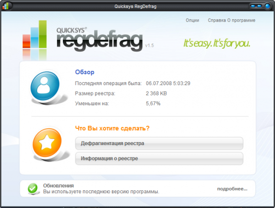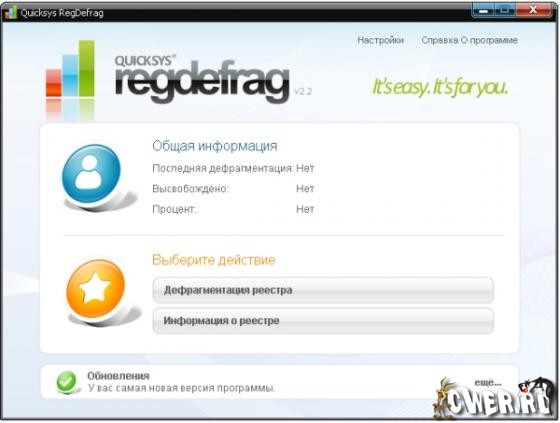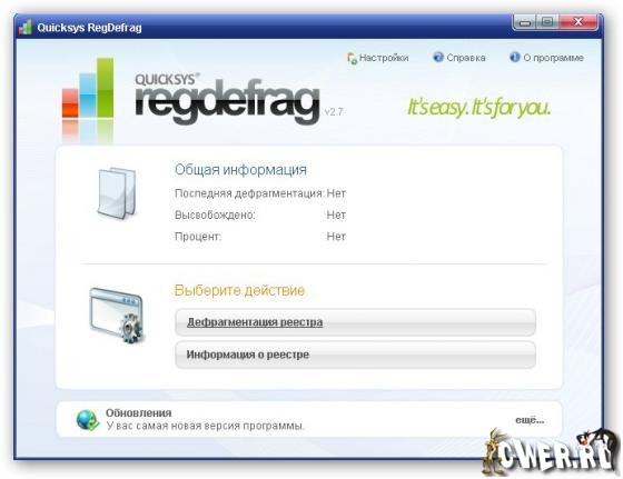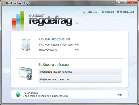 Программа для дефрагментирования реестра. Quicksys RegDefrag позволят в целом улучшить работу компьютера и повысить скорость доступа к реестру. Данные в реестре постоянно перезаписываются, удаляются и добавляются во время работы операционной системы. Через некоторое время эти данные становятся фрагментированными. Также программа оптимизирует файл реестра, удаляя из него пустые места, отдельное фрагменты и потраченное впустую место.