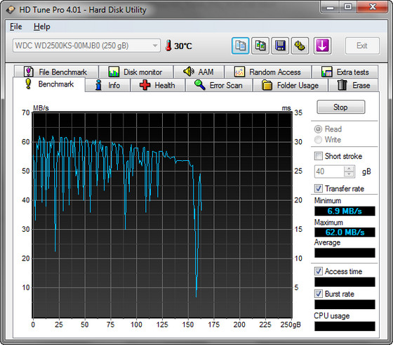 HD Tune Pro - программа для планомерного детального тестирования текущей работоспособности и производительности жестких дисков / SSD с различными интерфейсами (SCSI, SATA или IDE), а так же карт памяти и flash-дисков. Программа производит замер и наглядно отображает такие параметры накопителей, как скорость передачи данных, время чтения, записи и время доступа, уровень загрузки процессора, температуру винчестера, показывает в виде сводной таблицы данные поставляемые S.M.A.R.T, позволяет сканировать жесткие диски и другие накопители на предмет наличия ошибок, выдает информацию о версии firmware, серийном номере, объеме диска и подробности по потребителям полезной площади, его КЭШа, возможном и активном режимах передачи данных и т д. и т.п.