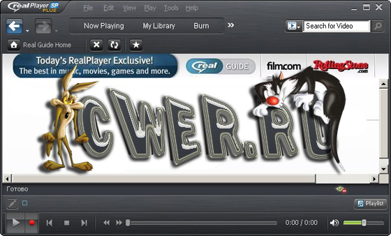 RealPlayer - популярный проигрыватель аудио и видео. Проигрыватель интегрирован с веб-порталом RealNetwork, что позволяет пользователю быть в курсе всех событий, транслируемых через Интернет. Данная программа предназначена для воспроизведения потоковых видео и аудио, постоянно используемых в Сети, а также умеющая работать с QuickTime, Windows Media, MPEG, DVD и VCD файлами.