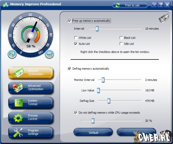 Memory Improve Professional – это один из полезных инструментов, который в информативной форме в виде прибора показывает текущее состояние потребления памяти и может автоматически или вручную производить дефрагментацию и освобождать для вас ресурсы в виде дополнительной памяти. Это в целом улучшит работу системы, уменьшит время её загрузки и повысит её производительность.