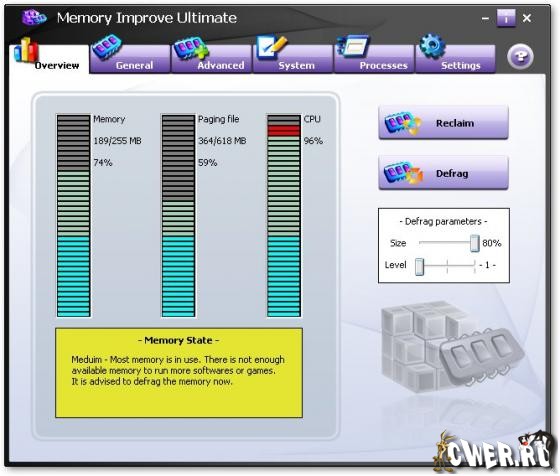 Memory Improve Master - позволяет увеличить быстродействие вашего компьютера за счет освобождения (дефрагментации) оперативной памяти. Имеется возможность установки минимального количества свободной оперативной памяти, при превышении которого запустится модуль и попытается удалить из оперативной памяти лишние процессы. Кроме этого, есть возможность просмотра запущенных процессов, наблюдение за нагрузкой на ЦП и множество других полезных настроек.