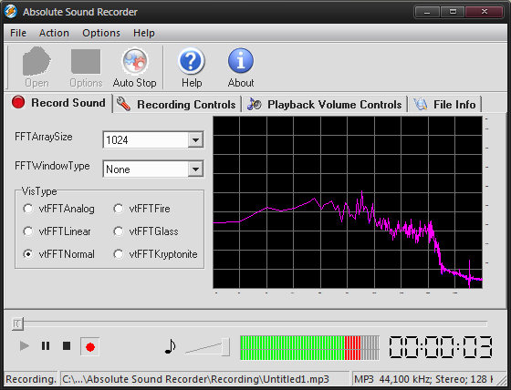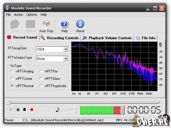 Absolute Sound Recorder - позволяет записать звук с любого источника: микрофон, линейный вход, аудио сигналы из Интернет, аудио/видео проигрывателя, игрушек и любой другой звуковой сигнал который поступает на звуковую карту. Записанный звук Absolute Sound Recorder может сохранить в большинстве распространенных аудио форматах, среди которых WAV, MP3, WMA и т.д.