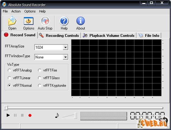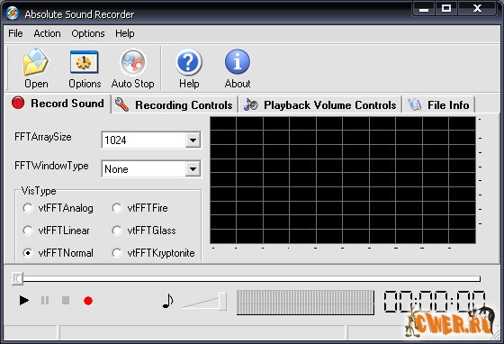 Absolute Sound Recorder позволяет записать звук с любого источника: микрофон, линейный вход, аудио сигналы из Интернет, аудио/видео проигрывателя, игрушек и любой другой звуковой сигнал который поступает на звуковую карту. Записанный звук Absolute Sound Recorder может сохранить в большинстве распространенных аудио форматах, среди которых WAV, MP3, WMA и т.д.